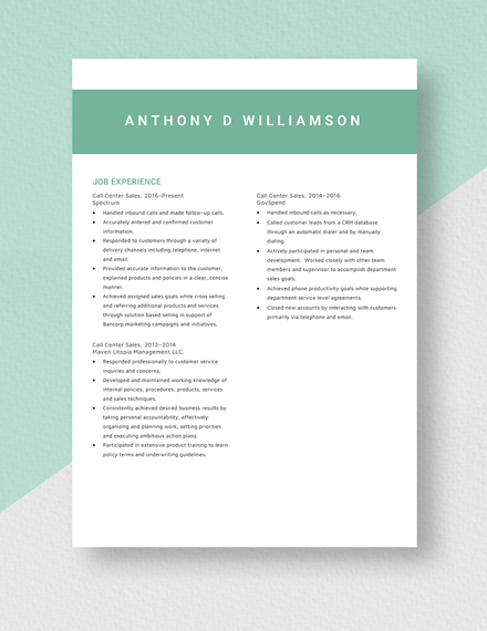 38 Bpo Resume Templates Pdf Doc Free Premium Templates. Call center sales resume examples & samples. The fictitious michael lopez makes his experience in the field clear by adding it first thing, right below his name. This sample resume highlights an employee with call center experience. What to write in a call center resume objective. However such marketing needs the salespersons with special abilities such as knowledge of phone. Call center/sales representative with 8 years of experience is seeking a position that offers advancement and utilizes my skills and knowledge in the field of sales and inventory. Find the best call center sales representative resume examples to help you improve your own resume. Writing tips, suggestions and more. Resume objective you should highlight your attitude toward the job. If the call center agent breaks down the client could lose valuable sales. Such a salesperson that does marketing is commonly known as call center sales representative. Ability to manage stressful situations; Also a sample of a call center sales representative resume is presented at the end. Driven to meet quotas and targets; Companies sign up with call centers to.