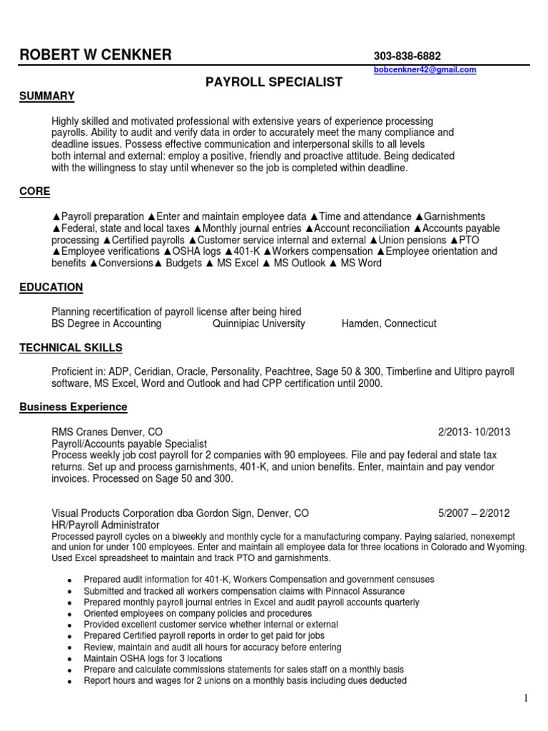 Each payroll resume sample here is carefully picked from our collection. If you are an employer seeking qualified job seekers for your payroll specialist position, read our sample job description. Gathering information on hours worked for each employee. Resumes in this field showcase such responsibilities as collecting. Do a sum and get your winning resume! There is a simple hiring formula: • list your skills and potentials that might be beneficial to the prospective firm. Maintain employee payroll records and timesheet data for future references. Top materials for senior payroll specialist job interviews: A document in which you effectively demonstrate your qualifications can help. Payroll specialist resume samples with headline, objective statement, description and skills examples. Using the right words on the resume is often as crucial as including the right examples of your experience. The payroll specialist assembles the payroll and time data for organizations. Find 100% professional payroll resume examples to help you build your resume in 2020. We are looking for an experienced payroll. Additional hr resumes are available in our database of sample resumes. Your working experience and skills plus our functional resume builder. Resume sample of a payroll administrator with several years of experience. Payroll specialist resume samples and examples of curated bullet points for your resume to help you get an interview. Are you looking for a payroll specialist job? Our payroll resume examples and professional writing tips can help you create a resume that will make employers want to show you the. Payroll specialists manage employee salaries, finances, and tax information for a company. Curriculum vitae (resume) example payroll accountant, professional, analyst, administrator, specialist, supervisor. Payroll specialists collect employee data, calculate wages, prepare paychecks, and process employee payroll specialist job description template. Crafting a payroll specialist resume that catches the attention of hiring managers is paramount to getting the job, and livecareer is here to help you stand out from the competition. A payroll specialist has the key task of ensuring that the salary of staff is paid on time. Your resume gives hiring managers an initial impression of your professional capabilities. Browse senior payroll specialist resume samples and read our guide on how to write a senior since we've looked over 2104 senior payroll specialist resumes, we're close to being experts to. Oller 2274 taylor street new york, ny 10011 phone: Each payroll resume sample here is carefully picked from our collection. Analyze payroll issues and recommend corrective actions.